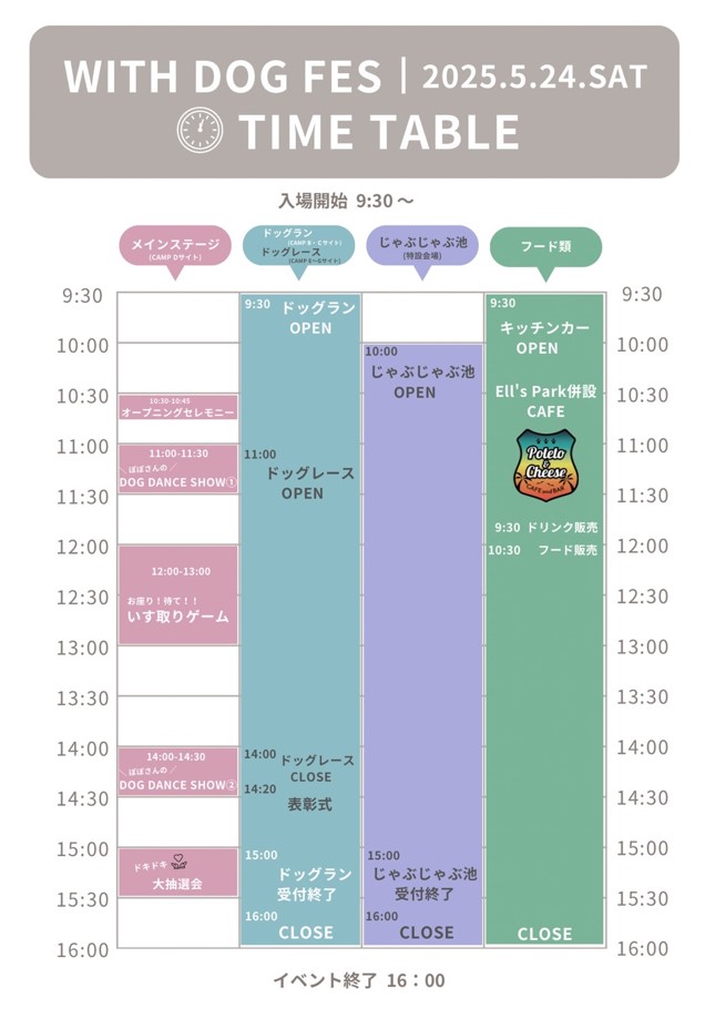 初めてのドッグランでも安心!景品が当たる抽選会も!愛犬との絆を深めるコンテンツがたくさん! 『WITHDOGFES』の開催概要 開催日:2025年5月24日(土曜日)※雨天中止会場:エルズパーク長瀞 埼玉県秩父郡長瀞町大字長瀞1715開催時間:10:30(受付9:30)~16:00入場料:1人 1,000円 ※飲食・物販・アクティビティ利用料は別途主催:エルズパーク長瀞(リバストン工業株式会社)後援:長瀞町 秩父鉄道株式会社 長瀞町観光協会お問い合わせ:エルズパーク長瀞 TEL0494-53-9550(受付時間9:00~16:00)駐車場:宝登山ロープウェイ駐車場をご利用ください。map 注意事項 ご参加にあたって:注意事項をご一読の上ご参加ください。 イベント中のご宿泊について WITHDOGFES開催中は、トレーラーハウスのご宿泊がご利用できます。イベント中もトレーラーハウスのプライベート空間でゆっくりできます。2025年5月23日~1泊または2泊のご利用が可能です。 『連泊プラン』 『前泊プラン』 Instagram ぽぽさんのドッグダンスショー ・ぽぽさんのドッグダンスショー:11:00・14:00人気インフルエンサーぽぽさんのドックダンスショー、息のぴったり合ったダンスをお楽しみください。 抽選会 エルズパーク長瀞 宿泊クーポン 参加賞宿泊クーポン10%割引券 全員 フードボール各3色×3 エルズパーク オリジナルTシャツ カフェバル ポテト&チーズ お食事券3000円分 エッセウーナおやつセット 5セット(ジャーキー・ぱりんこ)ケリーアンドコー ワンコ飯 プロムーブ50%オフ エルズパーク長瀞のみ使用可能1年間ワンバサダー るるちゃんから 1万円分の商品 犬のおもちゃ 抽選会 エルズパーク長瀞 宿泊クーポン 参加賞宿泊クーポン10%割引券 全員 フードボール各3色×3 エルズパーク オリジナルTシャツカフェバル ポテト&チーズ お食事券3000円分 エッセウーナおやつセット (ジャーキー・ぱりんこ)ケリーアンドコー ワンコ飯 プロムーブ50%オフ エルズパーク長瀞のみ使用可能1年間ワンバサダー るるちゃんから 1万円分の商品 犬のおもちゃ お座り。待て。椅子取りゲーム ルールは簡単、椅子取りゲームの応用版。参加無料でオリジナル景品あり。愛犬と一緒に椅子取りゲームを楽しめるWith Dogs ゲームです。曲が流れてるあいだは、ロープの外側をぐるぐる回っていただきます。曲が止まったら、ロープの外で愛犬にお座り、待てを指示していただき、愛犬が座っている状態の時に飼い主は椅子に座れます。飼い主が座ってから3秒経過でクリア。3秒立つ前に愛犬がお座りできなくなってしまった場合は再度ロープの外に行き、お座り、待てを行う。その際、椅子が空いたら座れていなかった飼い主が横取りできる。椅子をひとつずつ減らして最後の一組になるまで続ける。 おさんぽ宝探し ご来場のお客様にゲーム感覚で楽しんでいただくクロスワード◎施設内の至る所に問題が隠れています。◎縦・横のヒントを元に、問題を探して、わかった答えを当てはまる数字の所に記入。◎すべて埋めたあとにA~Iの文字を順に並べると出てくる答え。◎導き出した言葉をスタッフに伝えるとオリジナルステッカーをプレゼント! おさんぽ宝探し ご来場のお客様にゲーム感覚で楽しんでいただくクロスワード◎施設内の至る所に問題が隠れています。◎縦・横のヒントを元に、問題を探して、わかった答えを当てはまる数字の所に記入。◎すべて埋めたあとにA~Iの文字を順に並べると出てくる答え。◎導き出した言葉をスタッフに伝えるとオリジナルステッカーをプレゼント! ドッグタイムレース タイムレース部門とWITH DOG部門の2種目タイムレース部門 (30m)・30mのタイムアタック・上位3位まで景品贈呈WITH DOG部門 (30m)・受付でゴールのタイムを予想してもらう・スタートから20m地点にいてもらいそこからわんちゃんと一緒にゴールを目指してもらう・後からゴールした方でタイムを計り予想してもらったタイムと実走のタイム差でのランキング・タイム差の少ない上位3位まで景品贈呈開催時間 11:00~14:00参加費 1回500円 ドッグラン ワンちゃんの体格に合わせたドックランでリードを外してのびのびと走り回れます。ご利用時間 10:00~15:001頭1,000円 ドッグラン ワンちゃんの体格に合わせたドックランでリードを外してのびのびと走り回れます。利用時間 10:00~15:00 1頭1,000円 フォトスポット エルズパーク長瀞内にはあちらこちらにフォトスポットがいっぱい!イベント限定のフォトスポットの設置するのでぜひわんちゃんの素敵な一枚を! マルシェ • 安心素材のおやつや、栄養満点のごはん わんちゃんの健康と美味しさを考えたフードがそろっています。 • おしゃれで可愛い愛犬のお洋服 季節にぴったりのアイテムから、写真映え間違いなしの一着まで! • プロによる愛犬マッサージ体験 日頃の疲れをほぐして、わんちゃんもリラックス。 • 愛犬撮影会 特設フォトブースで、とっておきの一枚をプロカメラマンが撮影! • エルズパーク限定オリジナルグッズ販売愛犬と一緒に、見て、触れて、楽しめるマルシェ体験をぜひお楽しみ